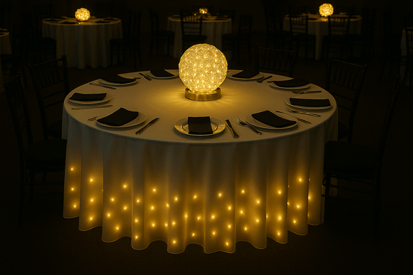 For a soft, romantic glow, place mini or icicle lights under the table skirts. This hidden lighting source creates a beautiful and unexpected effect that adds a touch of sophistication. - Tape Lights for a Modern Edge
