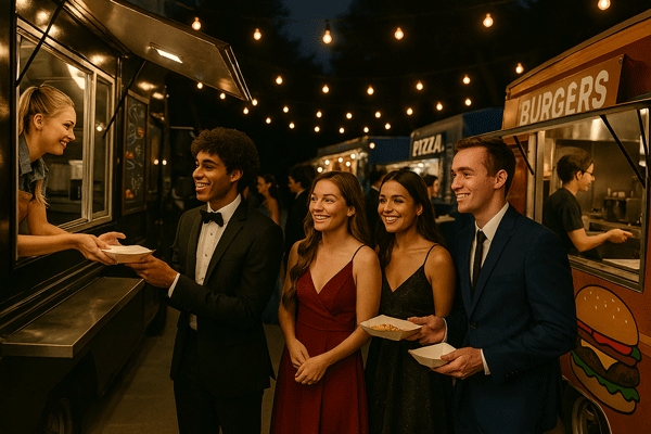When it comes to catering for an outdoor Prom, think casual and convenient. Food trucks are a popular and fun option, offering a variety of choices for students. A buffet-style setup or grab-and-go snack bars also work well.