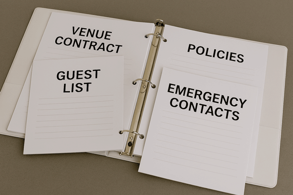 - Venue contracts: Keep printed copies to reference regarding hours, noise limits, or cleanup rules.