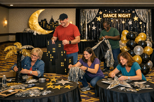 Teamwork makes the dream work, especially with large-scale décor. Having extra hands allows one person to hold pieces in place while another glues or tapes, ensuring better accuracy and cleaner lines. It also makes the work go faster, turning a daunting task into a fun, social activity for your prom committee.