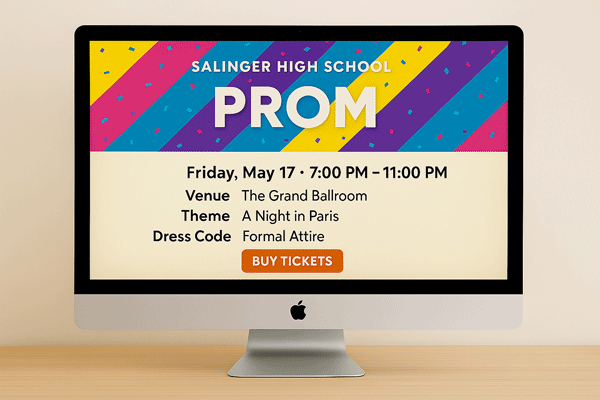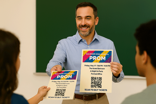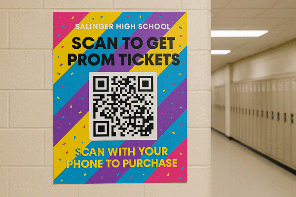 Place QR codes on hallway posters, morning announcement slides, and cafeteria displays. Keep the link to buy a Prom ticket easy to find at all times. Connect every promotional asset back to taking action. Show them the vibe, and then tell them exactly where to buy the ticket.