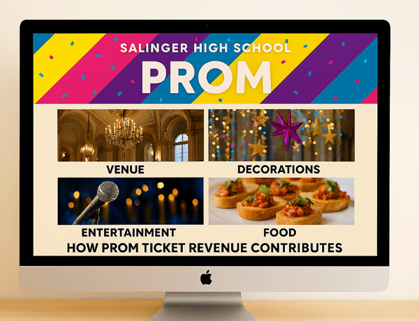 Explain that revenue from Prom ticket purchases directly impacts the overall event experience. Show students exactly how the money supports the venue costs, decorations, entertainment, and food.
